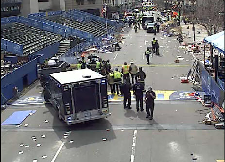 UPDATE: Fox News is reporting that at least three people were killed. Massachusetts General Hospital is reportedly treating four injuries. Officials are locking down the nearby Lenox Hotel. An employee there says he had to tie his apron around a woman’s severed limb. Multiple victims were seen bleeding, missing limbs.