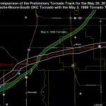 Many people are comparing the recent tornado in Oklahoma to the tornado that hit the same area on May 3, 1999. As you can see the path of the 1999 tornado follows a similar path as the one today.