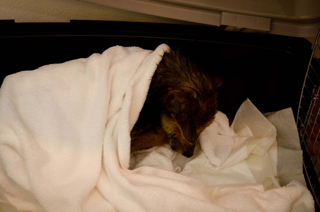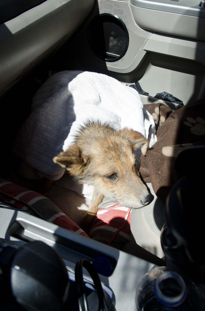 The officer said all he could do was leave the dog, because he would rather it have a chance in the world than take it to the shelter to be euthanized. There where hundreds of dogs like this all over the reserve, people would just kick them out of their way and leave them out in the elements he exclaimed. So I decided to take matters into my own hands and see what I could do for the fella. I had my girlfriend take our dog in the other car, and I made a bed fro this guys in my passenger seat. He barely had any strength to move and was happy to lay down on the soft blanket.