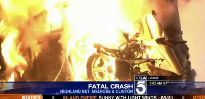 However, video taken by a local cameraman appeared to show that, moments before Hastings’ fatal crash, he was traveling at high speed when he ran a red light at the intersection of Highland Avenue and Santa Monica Boulevard, four blocks from the scene where the silver Mercedes slammed into a palm tree and burst into flames.