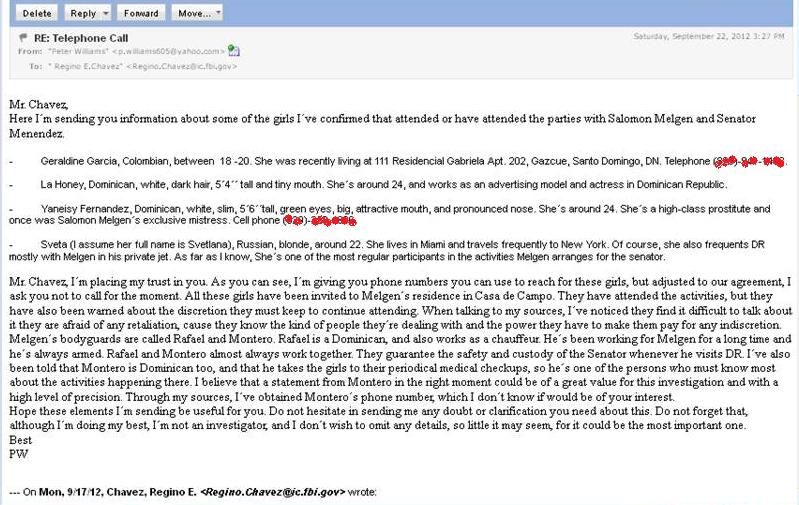 Another email string has been released naming some of the prostitutes involved with Dr. Melgen and Senator Menendez. Of the 4 prostitutes named, 2 were Dominican, 1 Russian, and another Colombian.